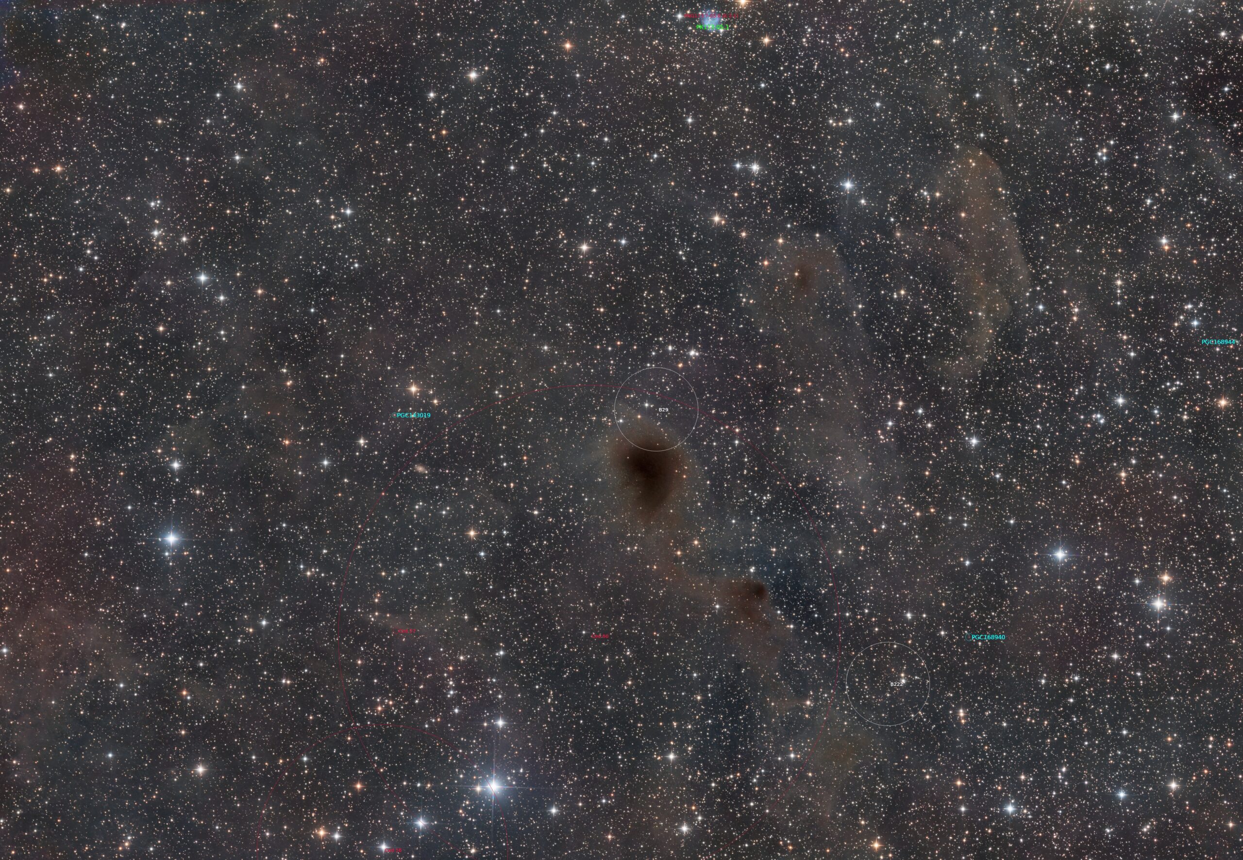 In 2025 I captured LRGB images of Barnard 29 from my own Jade Observatory. Barnard 29 refers to a dark nebula located in the constellation Auriga, part of Edward E. Barnard’s catalog of obscuring interstellar dust clouds. These dark nebulae are regions of cold, dense molecular material that block the light of background stars, appearing as irregular voids and lanes against the rich Milky Way star field.