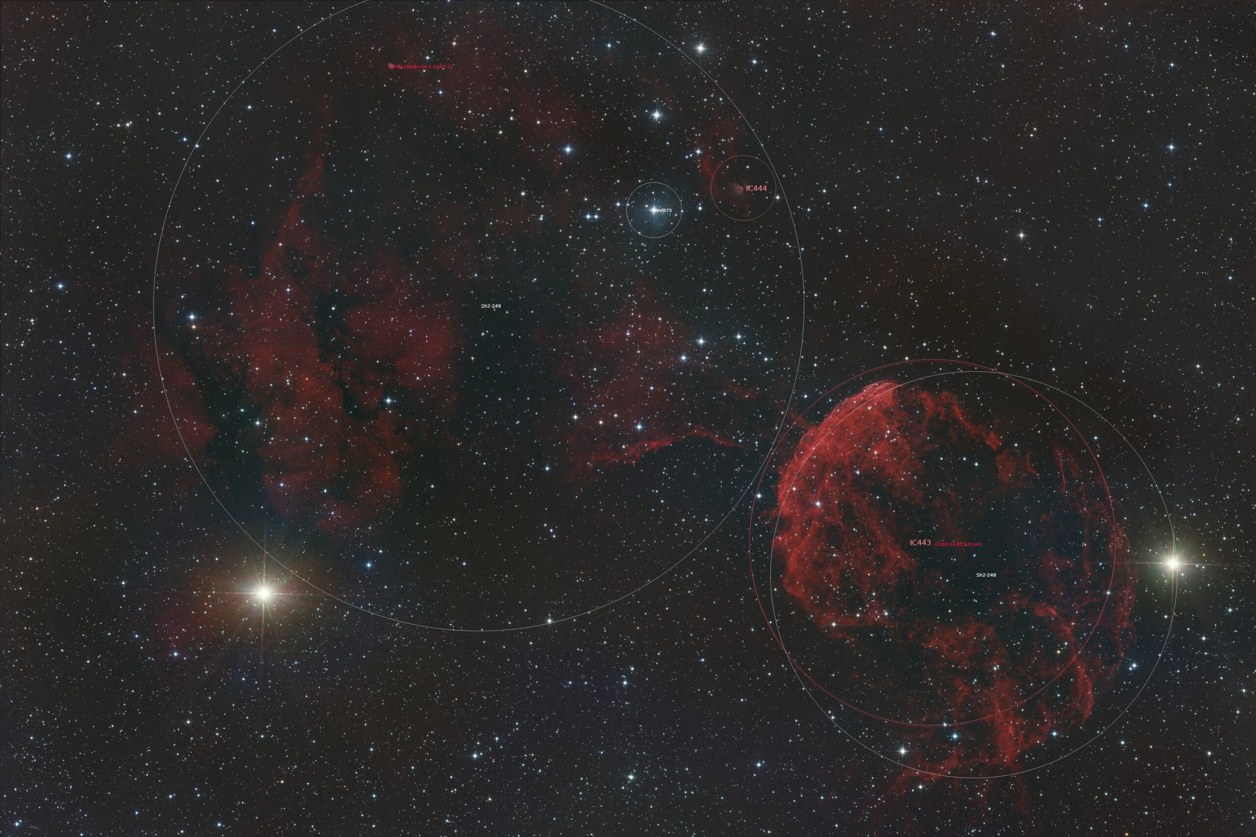 Most recently, in autumn 2025, I captured a much wider field using a modern CMOS camera. This new dataset not only shows IC 443 in greater detail but also includes the neighboring emission nebula Sh2-249, offering a richer view of the complex environment in this region of Gemini.