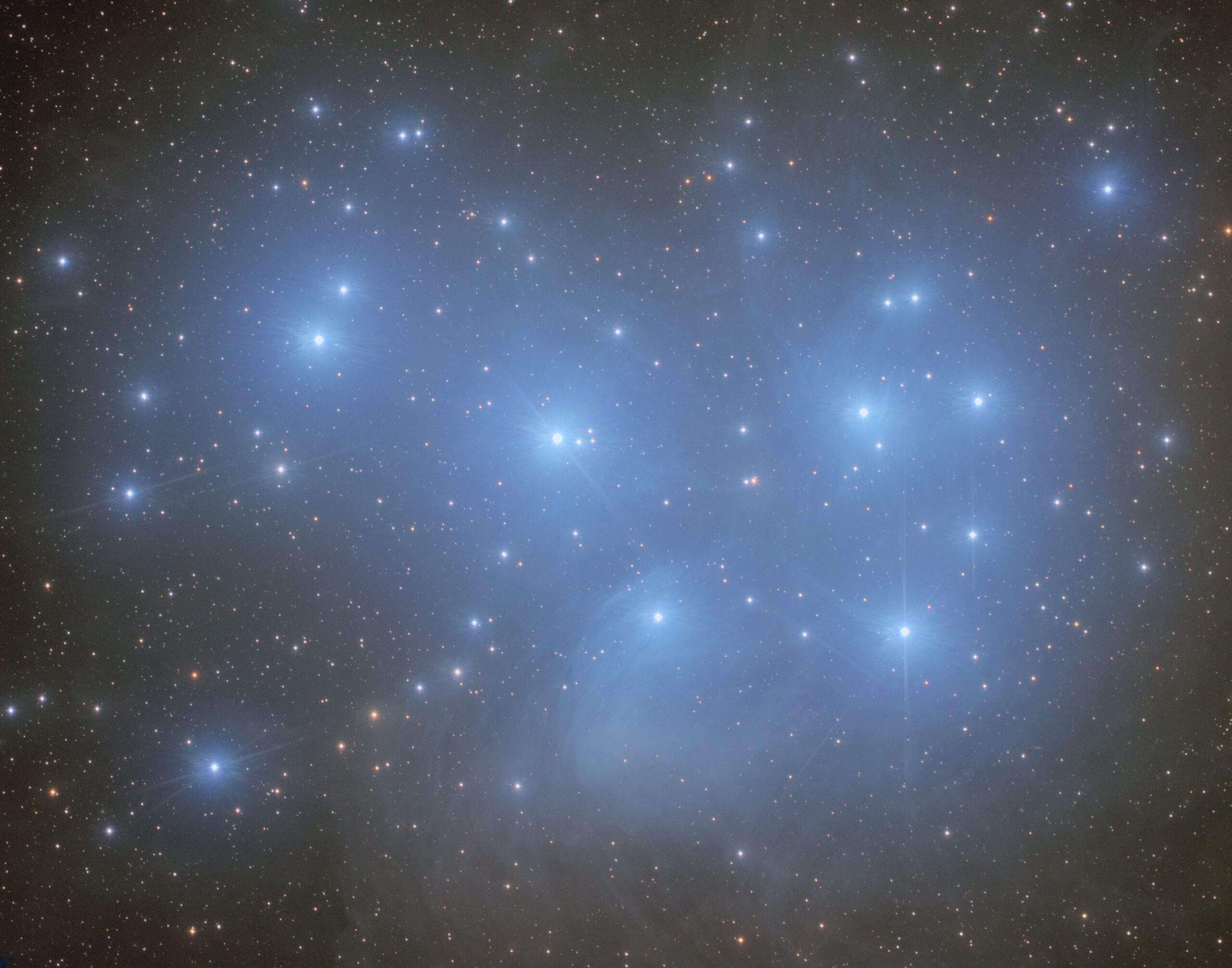Over the years, I have imaged Messier 45 (the Pleiades) multiple times under varying conditions and from different locations. My earliest datasets were acquired from my backyard under moderately light-polluted skies. A subsequent imaging session in Banon, southern France, provided significantly improved seeing conditions and darker skies, allowing for higher signal-to-noise ratios and better definition of the faint reflection nebulae surrounding the cluster’s bright B-type stars.