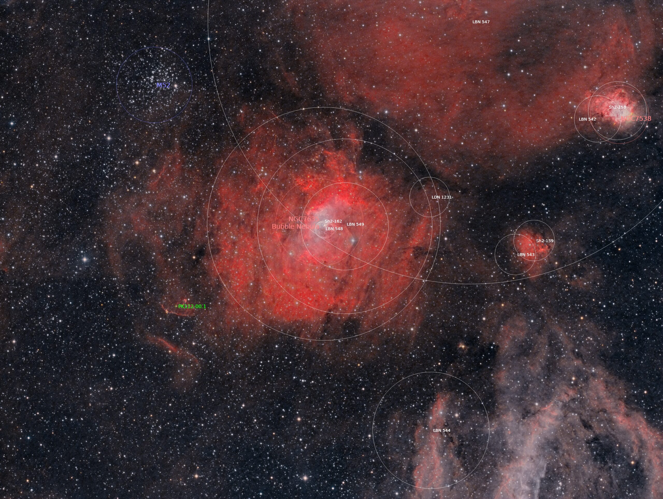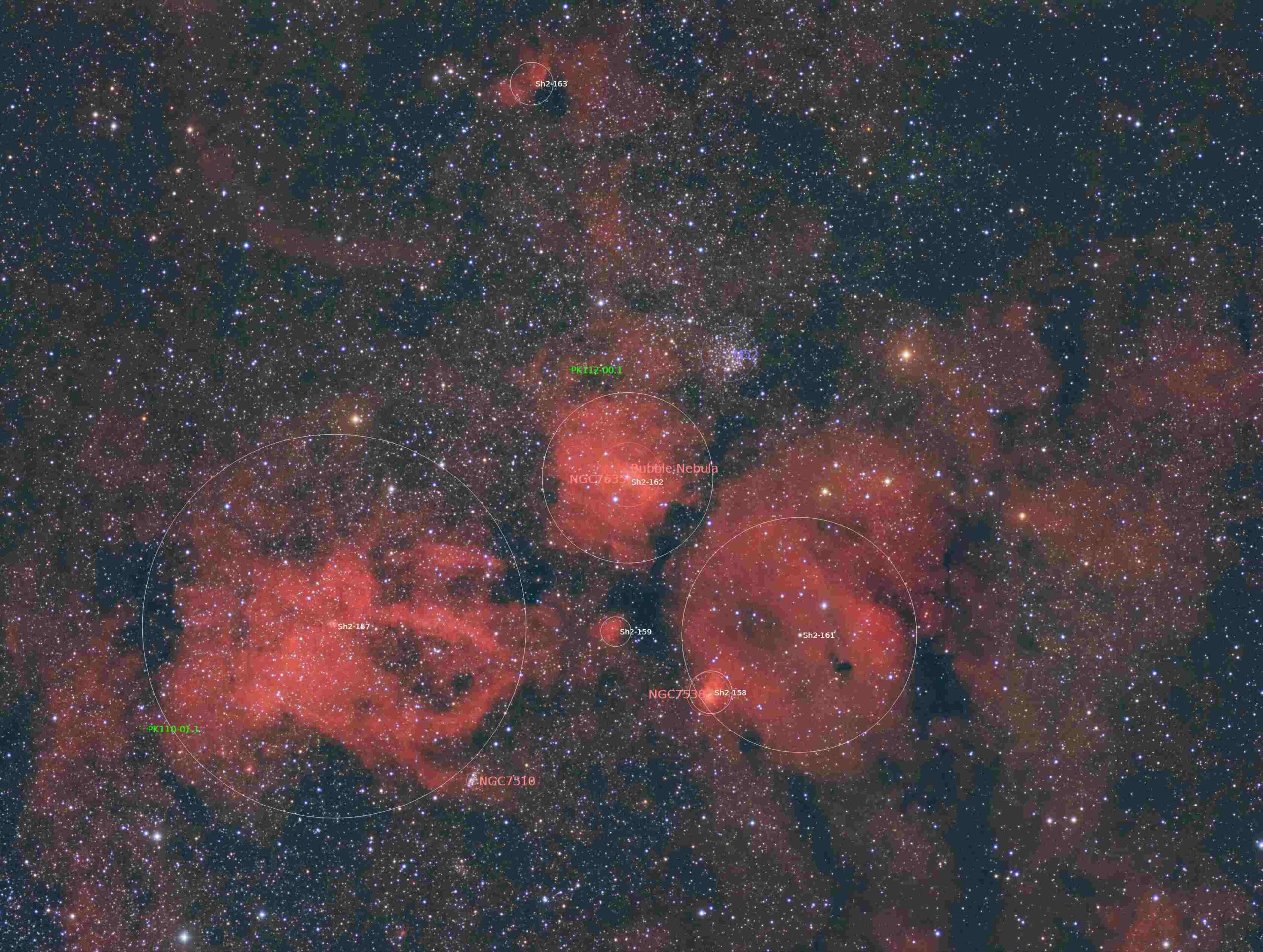 In 2016, I revisited the field from my backyard, this time using a 200 mm telephoto lens, producing a much wider field of view. Despite the more challenging sky conditions, this configuration successfully captured M52 and NGC 7635 within a broader context of the surrounding H II region, revealing the rich star fields of Cassiopeia and emphasizing the nebula’s position within the larger interstellar complex.