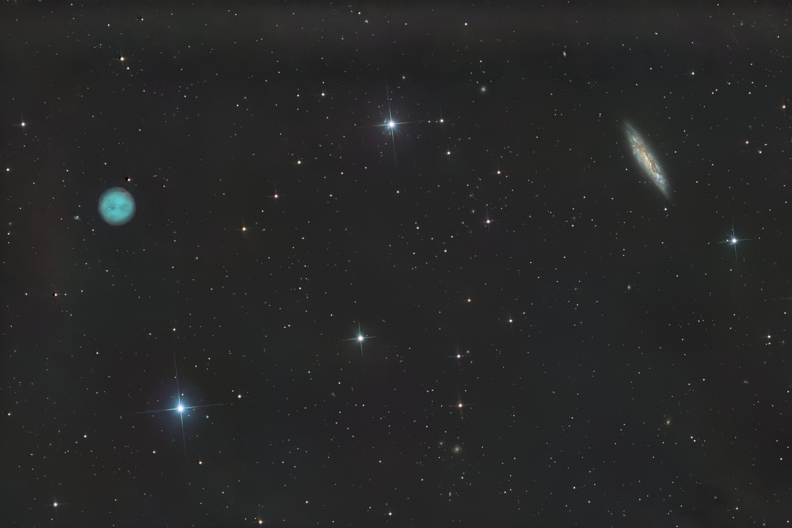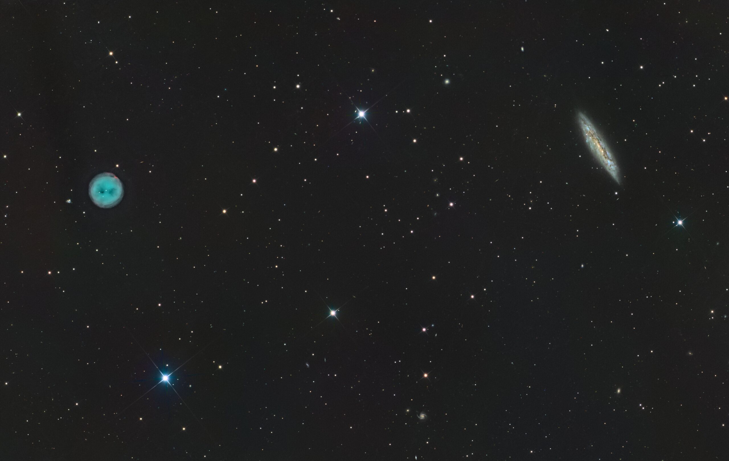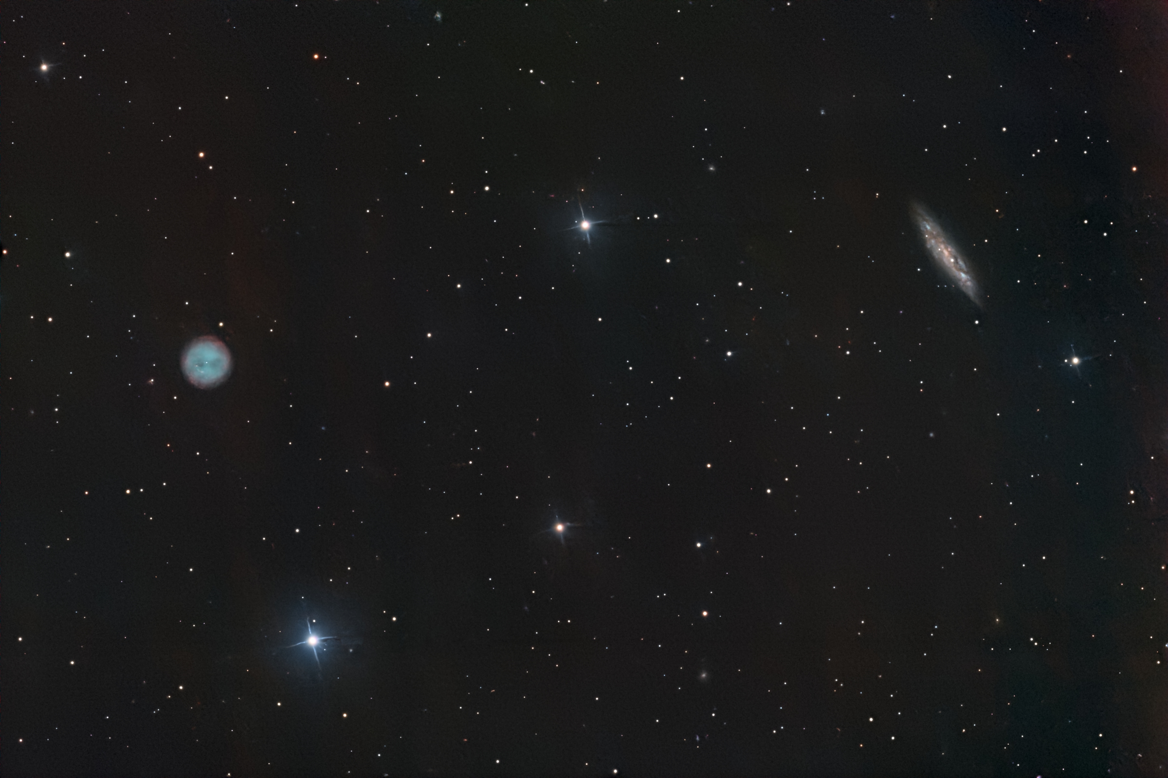 In contrast, Messier 108 is an SBcd-type barred spiral galaxy seen almost perfectly edge-on at a distance of about 45 million light-years. Its chaotic dust lanes, scattered H II regions, and clumpy star-forming knots make it a rewarding target for high-contrast processing. Together, the pair offers a striking juxtaposition of a dying star in our own galaxy and an entire island universe far beyond.