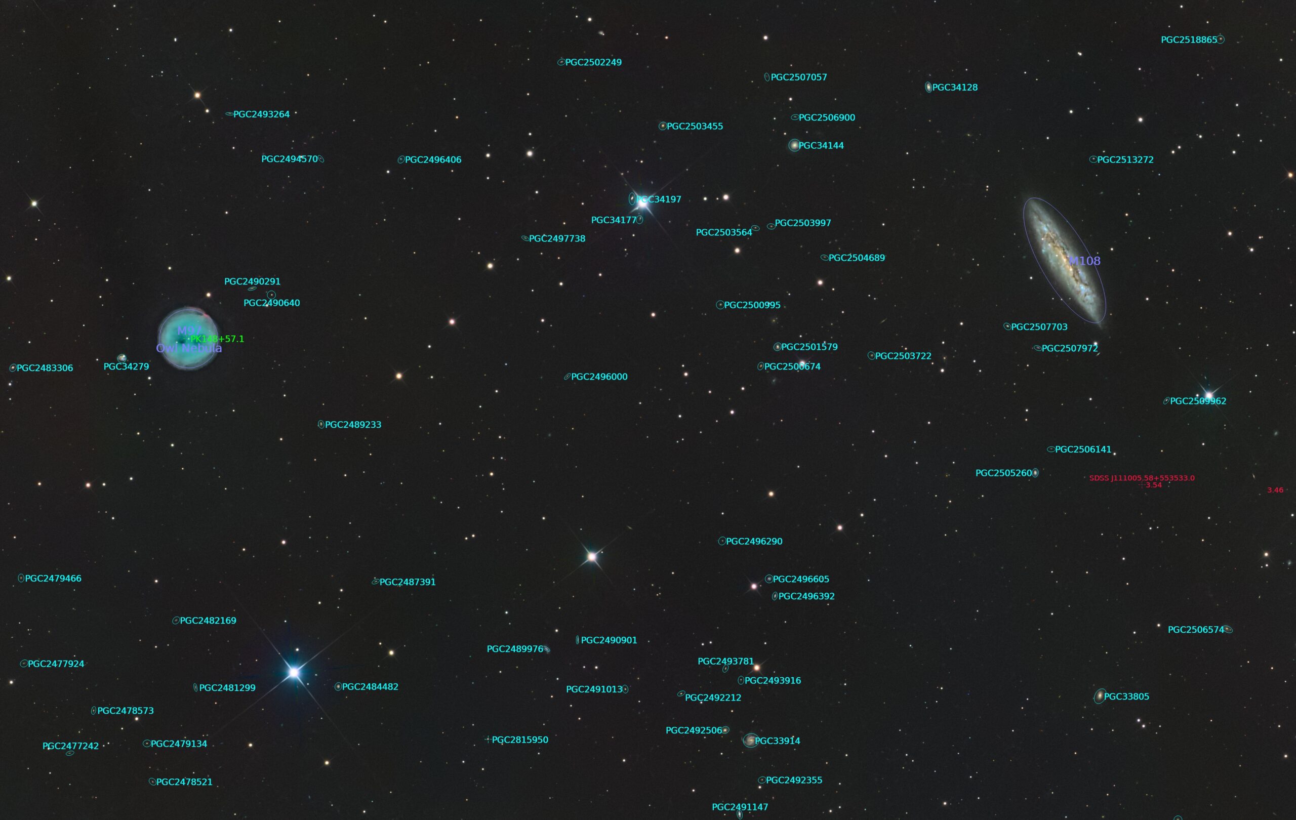 I imaged Messier 97 (the Owl Nebula) and Messier 108 (the Surfboard Galaxy) together in the same field on three occasions over the years. My first attempts came in 2010 and 2011, both using DSLR equipment from my backyard, where modest exposure times already revealed the striking contrast between the smooth planetary nebula and the dusty, edge-on spiral galaxy. Most recently, in 2025, I revisited this pair from my Jade Observatory, capturing a deep luminance dataset with modern CMOS hardware. I combined this high-resolution 2025 luminance with the 2011 RGB data to produce a new, significantly more detailed LRGB image of the field.