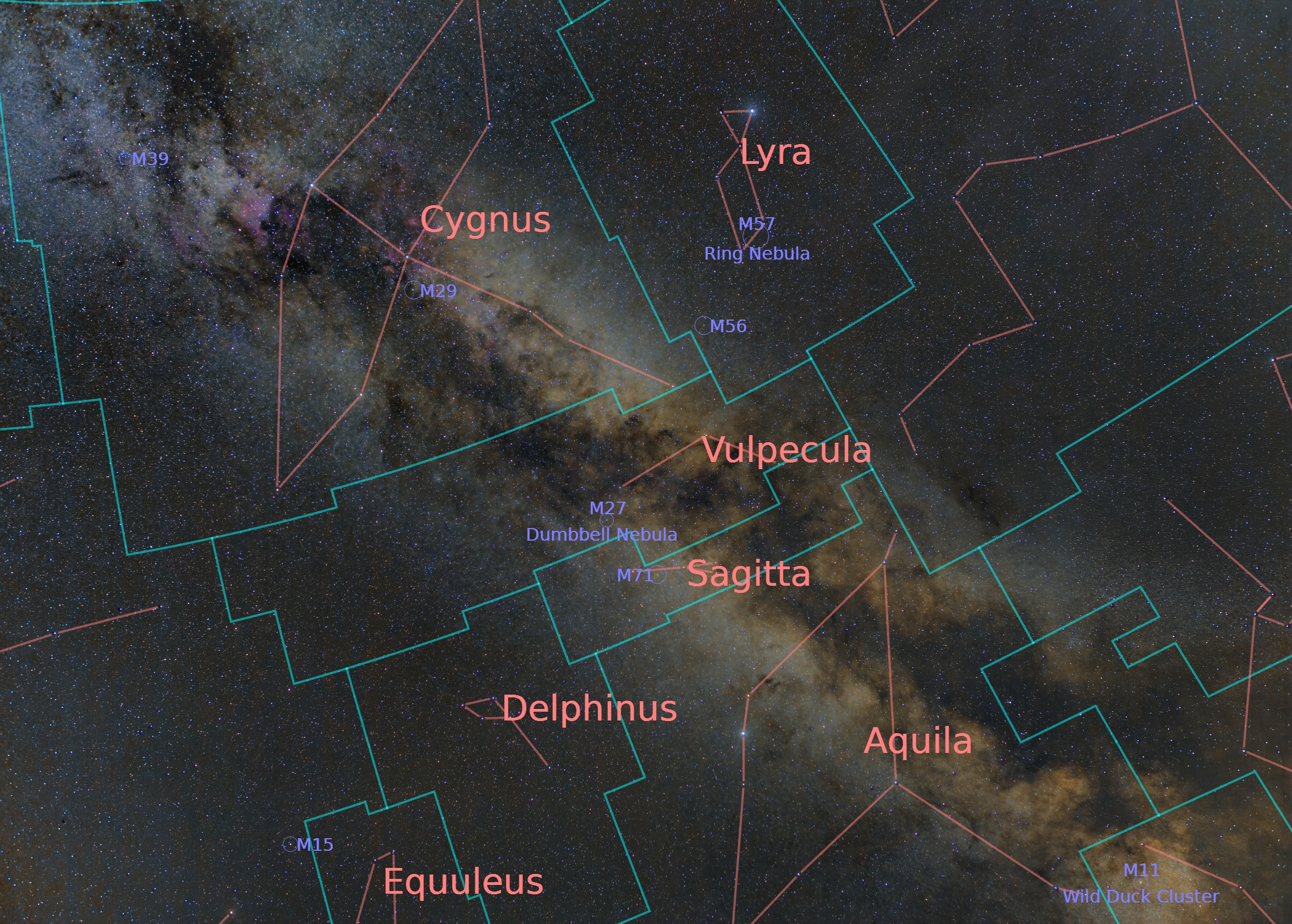 During my 2019 holiday in Banon, Southern France, I took advantage of the dark rural skies to capture a wide-field image of the Milky Way using my mobile DSLR setup. The resulting panorama spans a rich section of the night sky, stretching all the way from Cygnus—with the loose open cluster Messier 39—down to Scutum, where the dense star field around Messier 11 (the Wild Duck Cluster) marks the transition toward the bulge of the Galaxy. This region is packed with emission nebulae, star-forming complexes, dark dust lanes, and countless unresolved stars, making it one of the most rewarding parts of the Milky Way to observe and photograph. The dry summer nights in Banon offered excellent transparency, allowing the intricate structure of the Galactic plane to stand out beautifully in the final image.