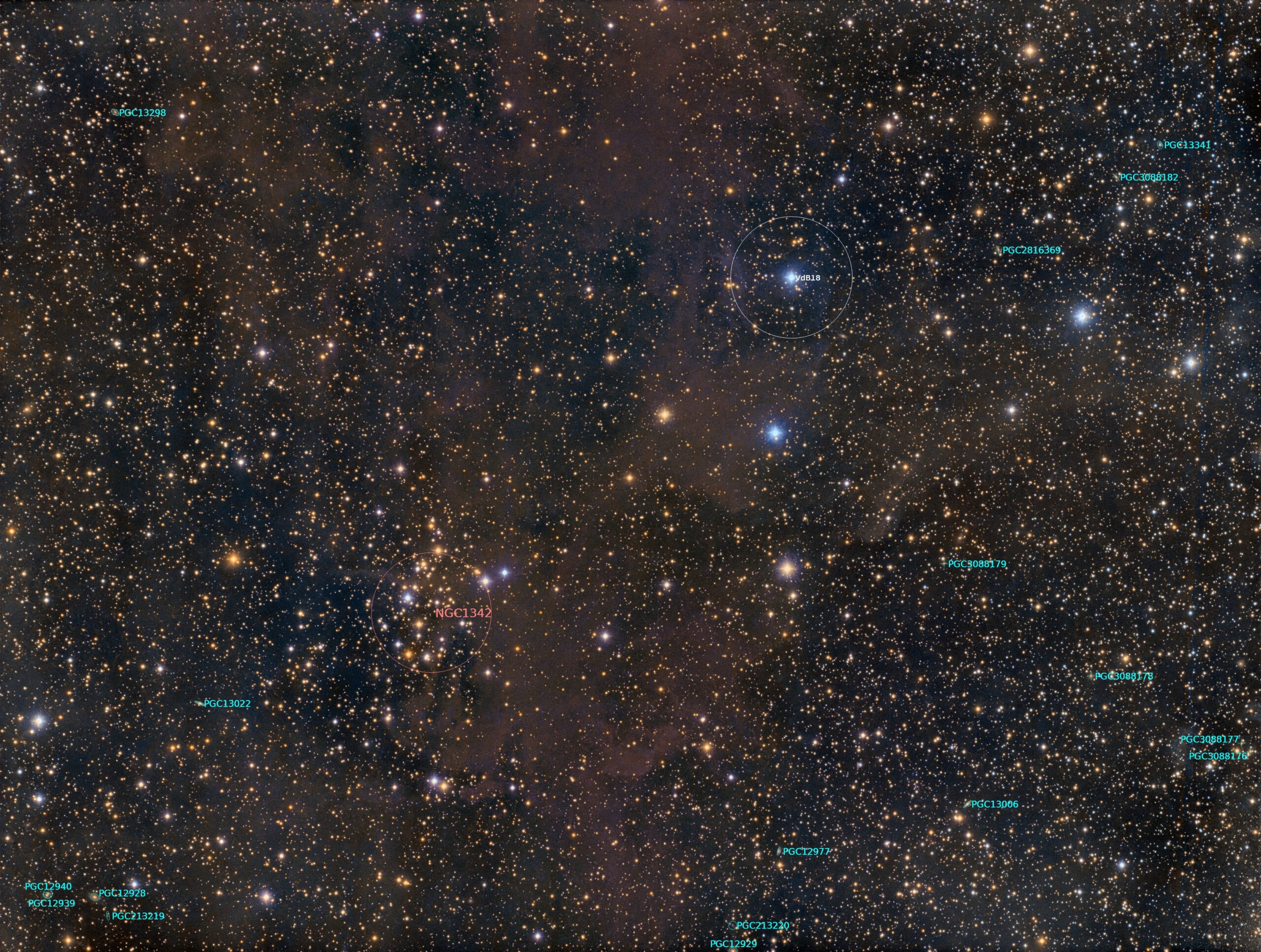 Although not as dense as many famous open clusters, NGC 1342 stands out against the rich Milky Way background of Perseus, and deep imaging reveals numerous faint background stars that emphasize the cluster’s loose and scattered structure.