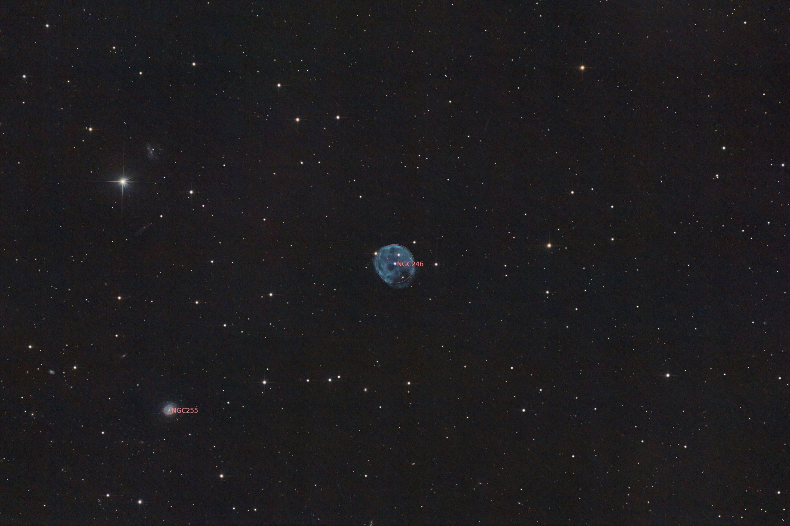 In 2010 I imaged the planetary nebula NGC 246—also known as the Skull Nebula—during a holiday in Banon, France, using my DSLR equipment under the region’s characteristically dark skies. The Skull Nebula is a large and relatively faint planetary nebula located in the constellation Cetus, spanning nearly 4 arcminutes and lying about 1,600 light-years away.